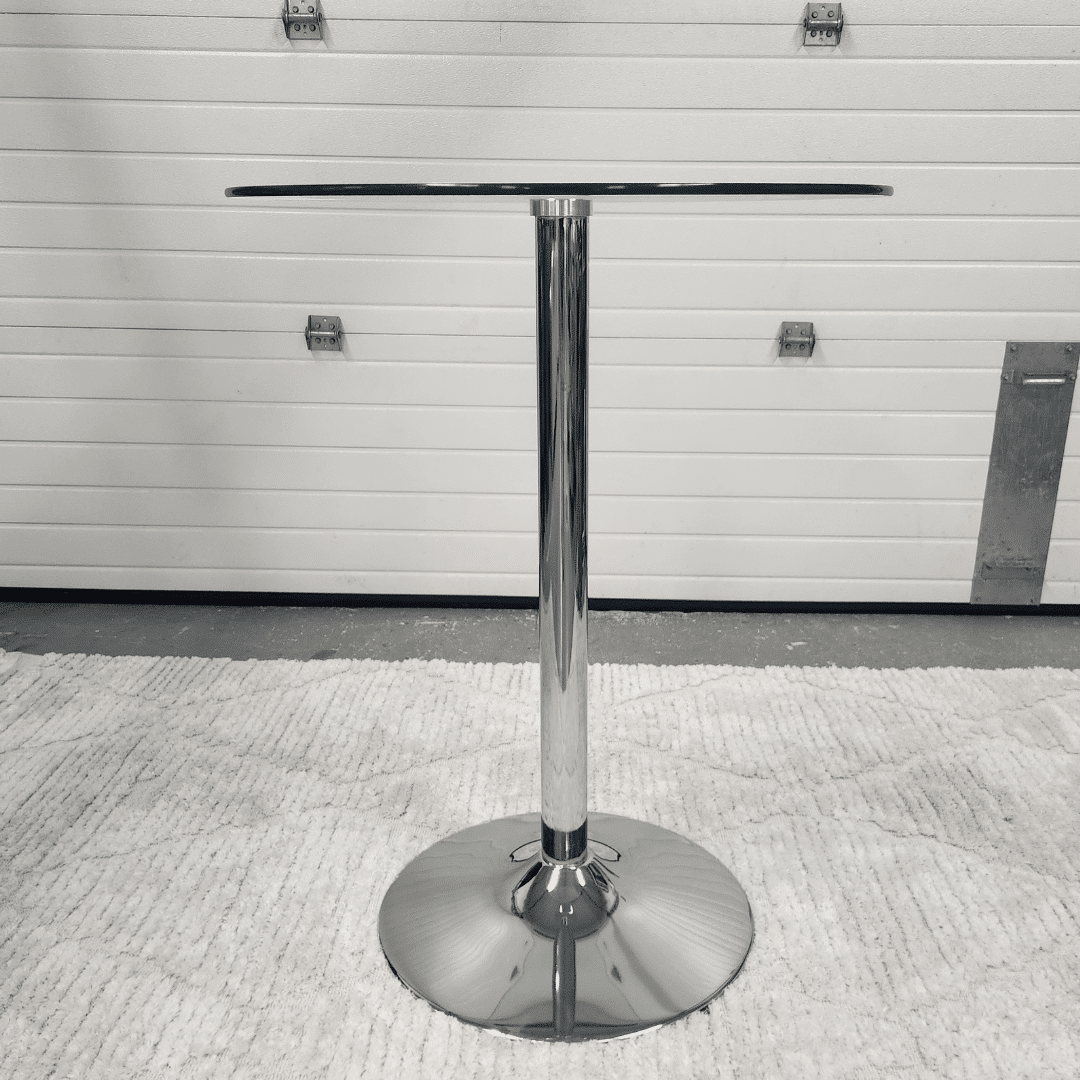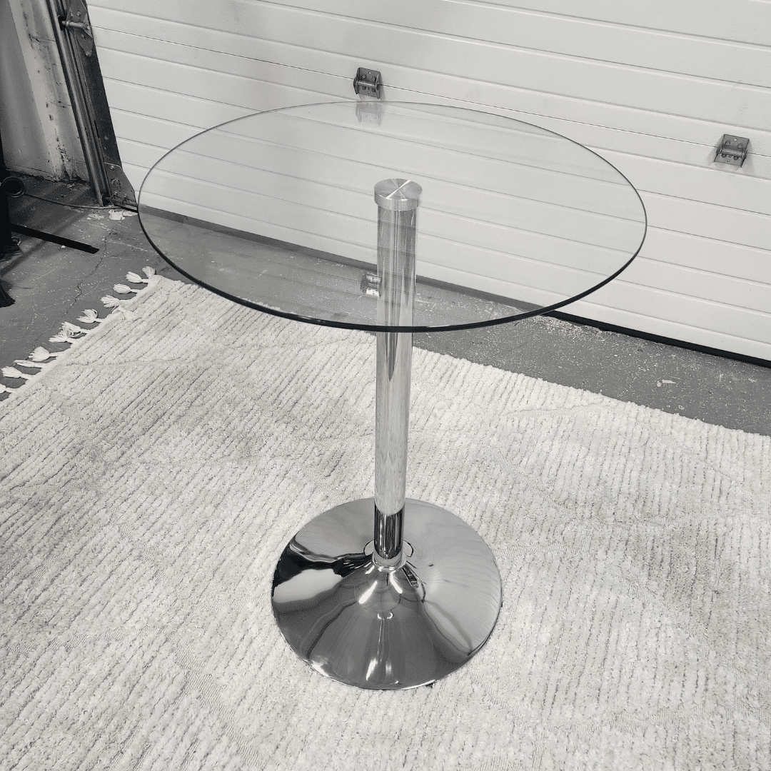 ‣ Glass top with polished chrome base